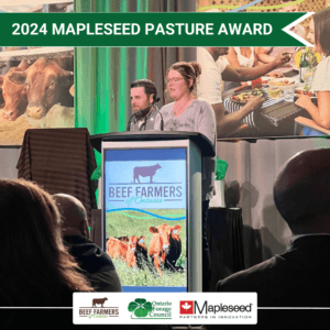 February 21, 2024 (Toronto, Ont.) – The Beef Farmers of Ontario, Mapleseed and the Ontario Forage Council, sponsors of the Ontario Mapleseed Pasture Award, are pleased to announce that the Chalmers family of JPD Angus of Oro-Medonte in Simcoe County are the recipients of the 2024 Mapleseed Pasture Award. The award was presented today at the Beef Farmers of Ontario Annual General Meeting Banquet in Toronto. For their environmental improvements and exceptional pasture management, JPD Angus received a cash award of $500 and a bag of forage seed, courtesy of Mapleseed.