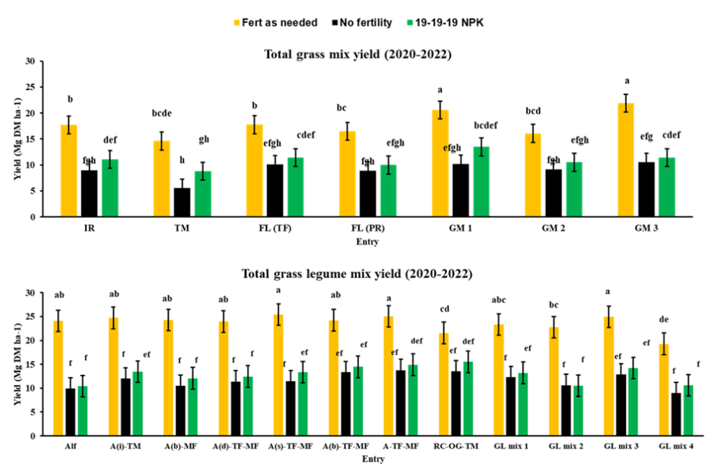 Forage quality was tested in the first year of the trial; it was found that the fertility treatment did not affect forage quality, but that the mixture’s species was the driving effect. In general, mixtures and monocultures with timothy and meadow fescue had greater Relative Forage Quality (RFQ) indices and protein concentrations, which is to be expected with these grasses. Unsurprisingly, legume mixtures with alfalfa, red clover, white clover, and grasses also produced good RFQ values and protein concentrations.