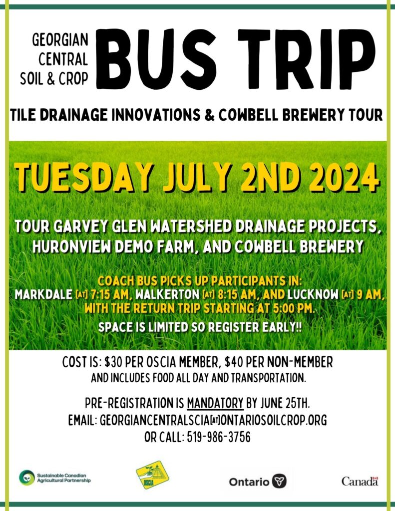 Georgian Central Soil & Crop is hosting a bus tour on Tuesday, July 2nd, 2024. Tour Garvey Glen Watershed drainage projects, Huronview Demo Farm, and Cowbell Brewery.