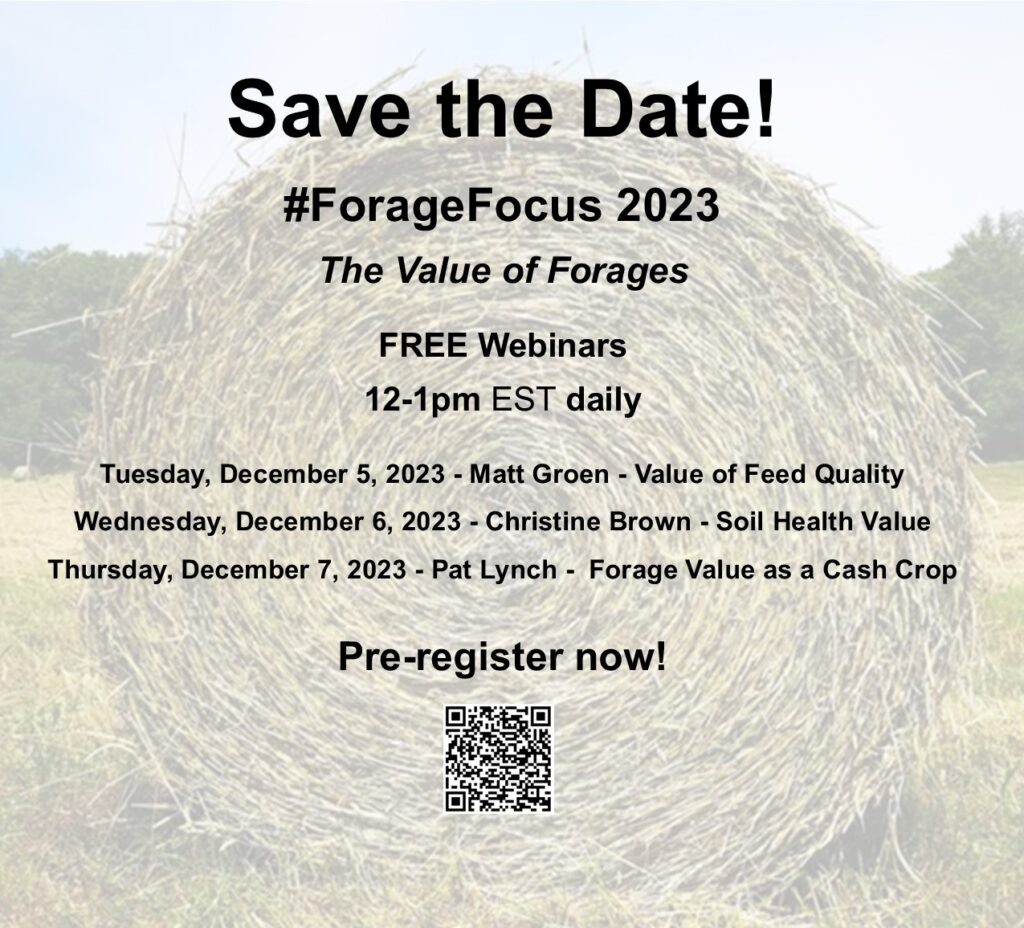 Ontario Forage Council is pleased to offer the Forage Focus webinar series again in 2023!  We will be hosting one webinar per day for three consecutive days: December 5, 6, and 7, 2023 from 12:00 – 1:00 pm EST.   Please spread the word!