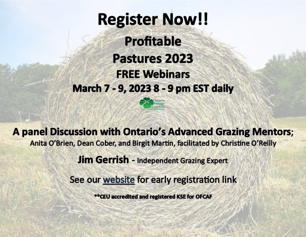 Due to the positive feedback, the Ontario Forage Council has decided to move forward with Profitable Pastures in a digital format for the foreseeable future.  We are in the final stages of planning for the Profitable Pastures 2023 FREE Webinar Series to be held from 8 – 9 pm EST each evening from March 7-9, 2023.  Each day will feature a different speaker and topic as outlined below.