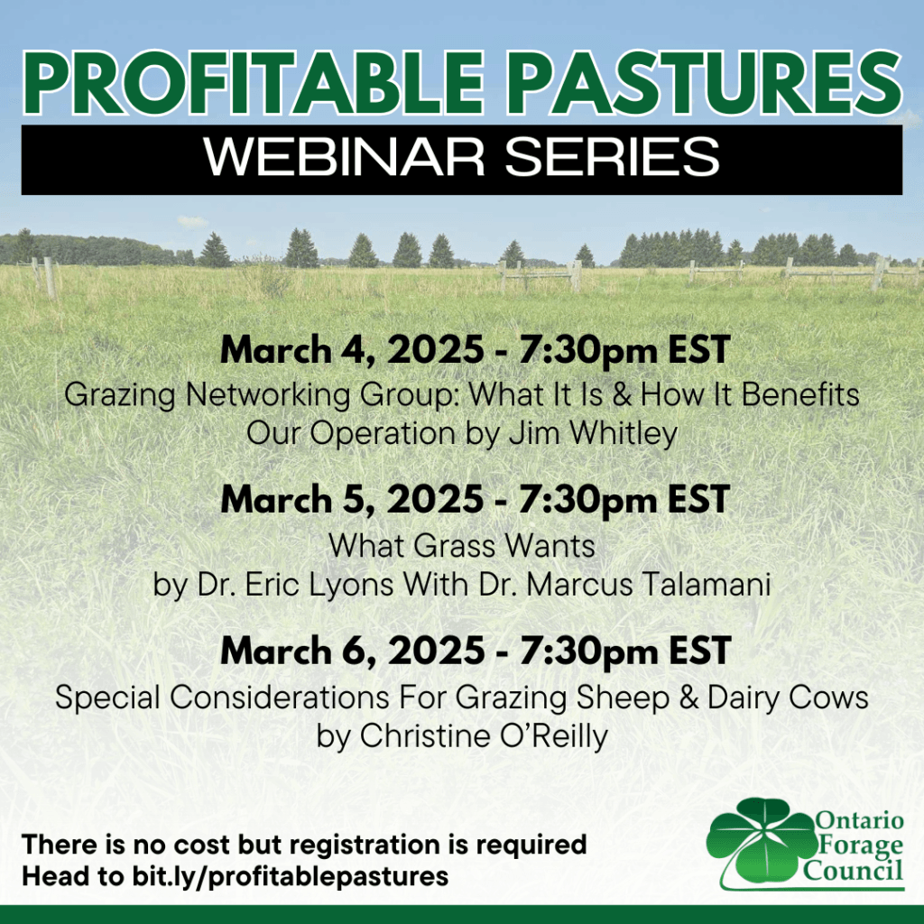 Ontario Forage Council’s popular Profitable Pastures webinar series happens March 4th to 6th this year. The nightly webinars happen from 7:30pm to 8:30pm EST each night and cover a variety of topics of interest to pasture and grazing managers.